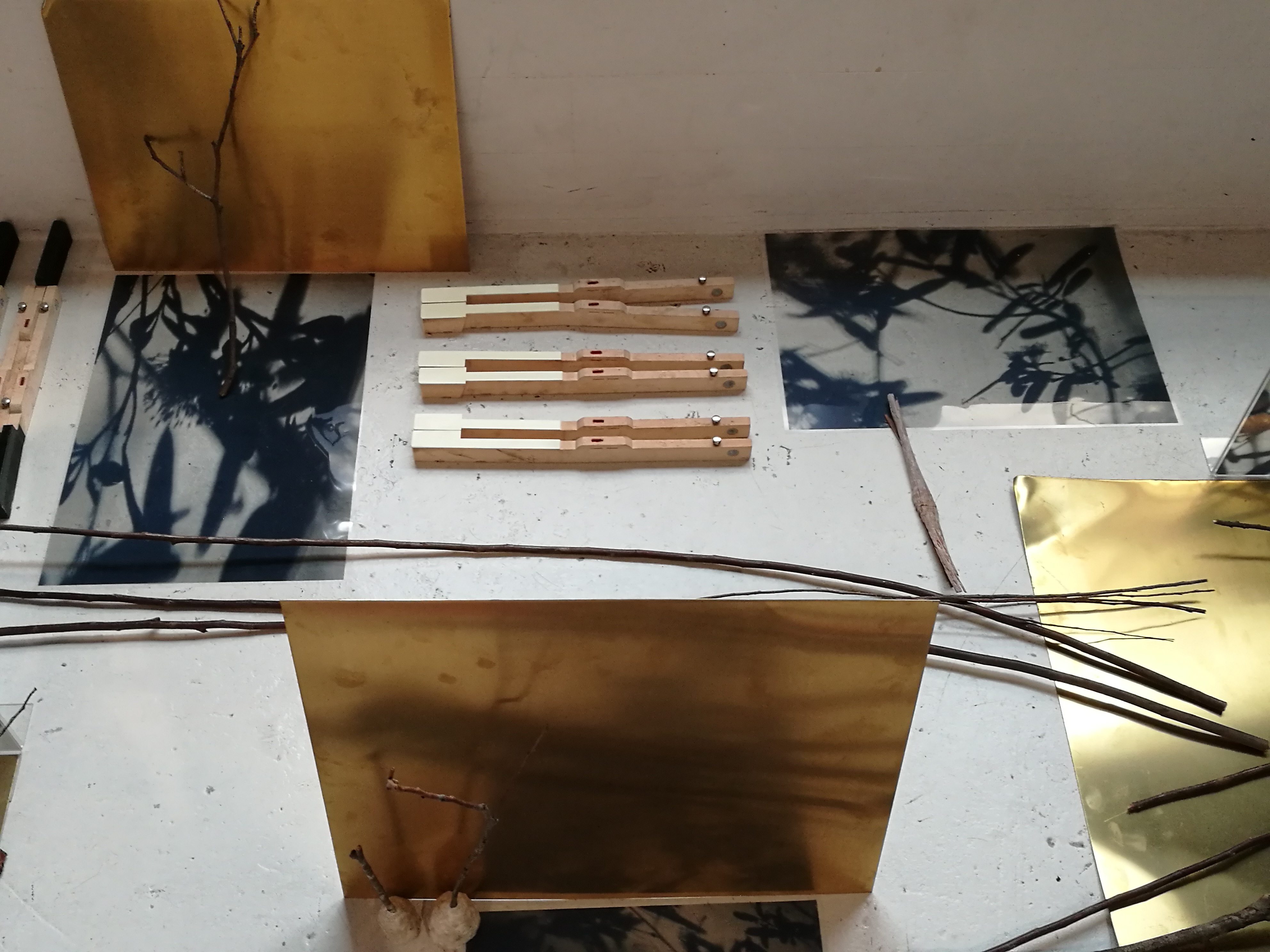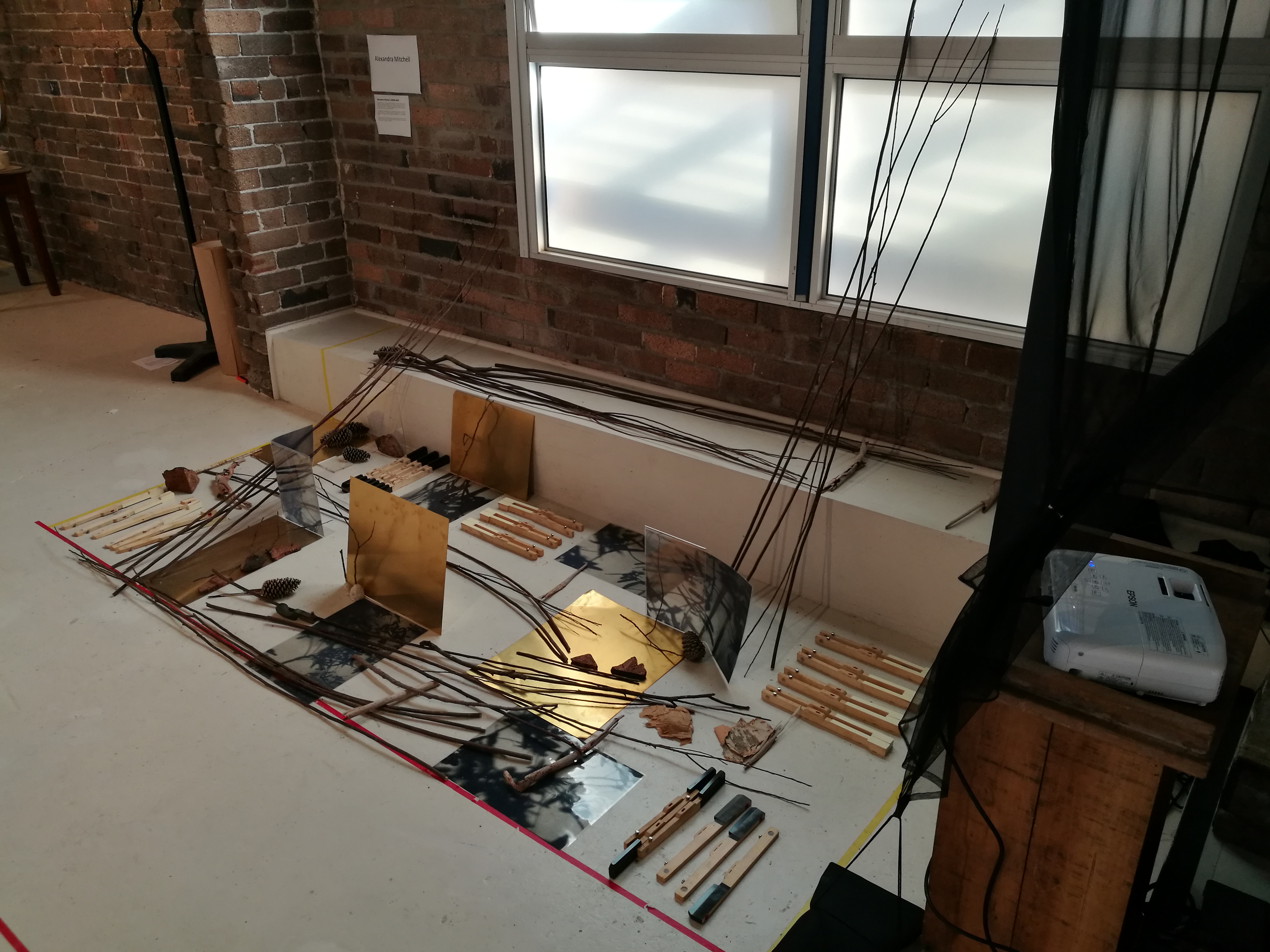 Installation documentation of Casting Shadows #2, 2017, brass sheets, perspex stands, bark, branches, piano keys, pine cones, wood segments, stones and piano pedal, dimensions variable, at Solidarity, Articulate project space, Leichhardt, Saturday 27th May - Sunday 18th June.
